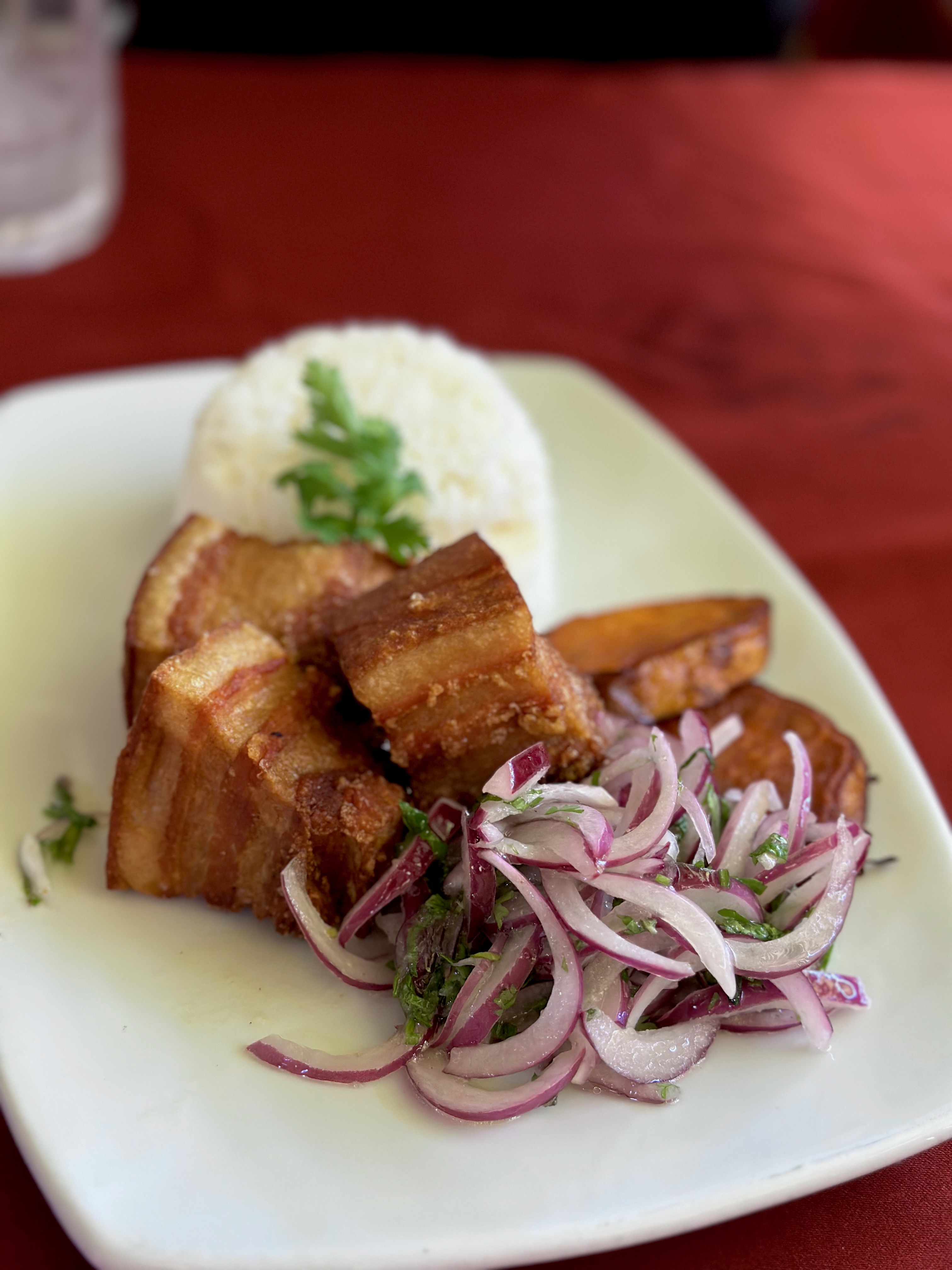 Chicharron is pork belly, simmered until the lard is rendered, then fried on itself